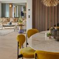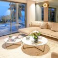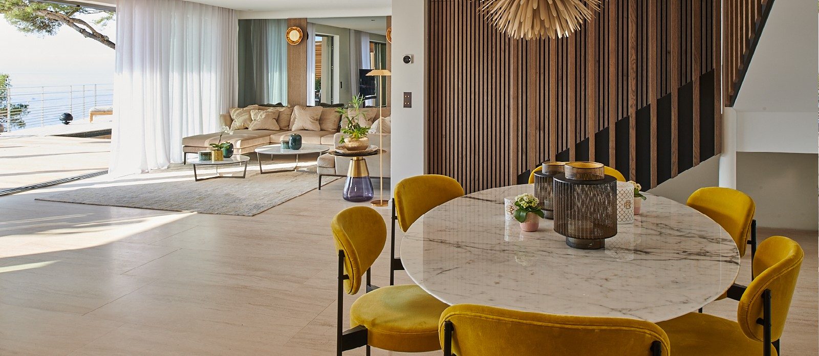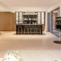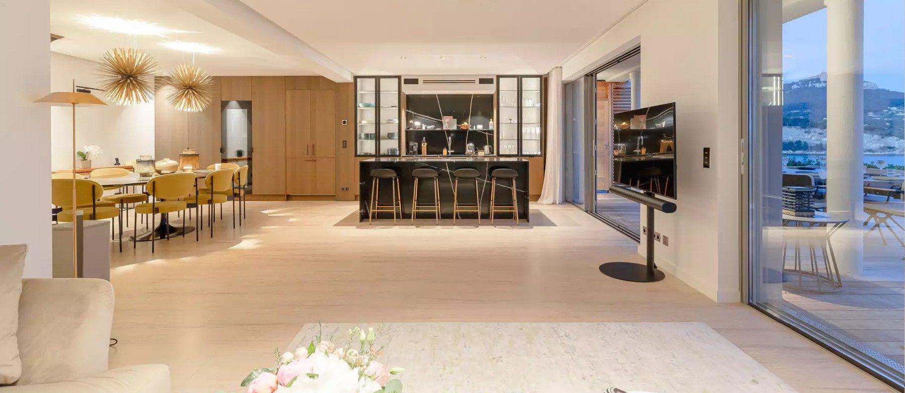 Level One. Living area, open plan dining room and kitchen  opening onto terrace and pool. Hammam and fitness room.