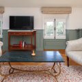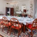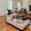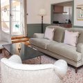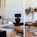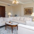 A ceiling adorned with elaborate moldings, together with pale colors and a magnificent bouquet, adds a touch of elegance and sophistication. The furniture in the living room is carefully chosen to complement the refined aesthetic of the whole.