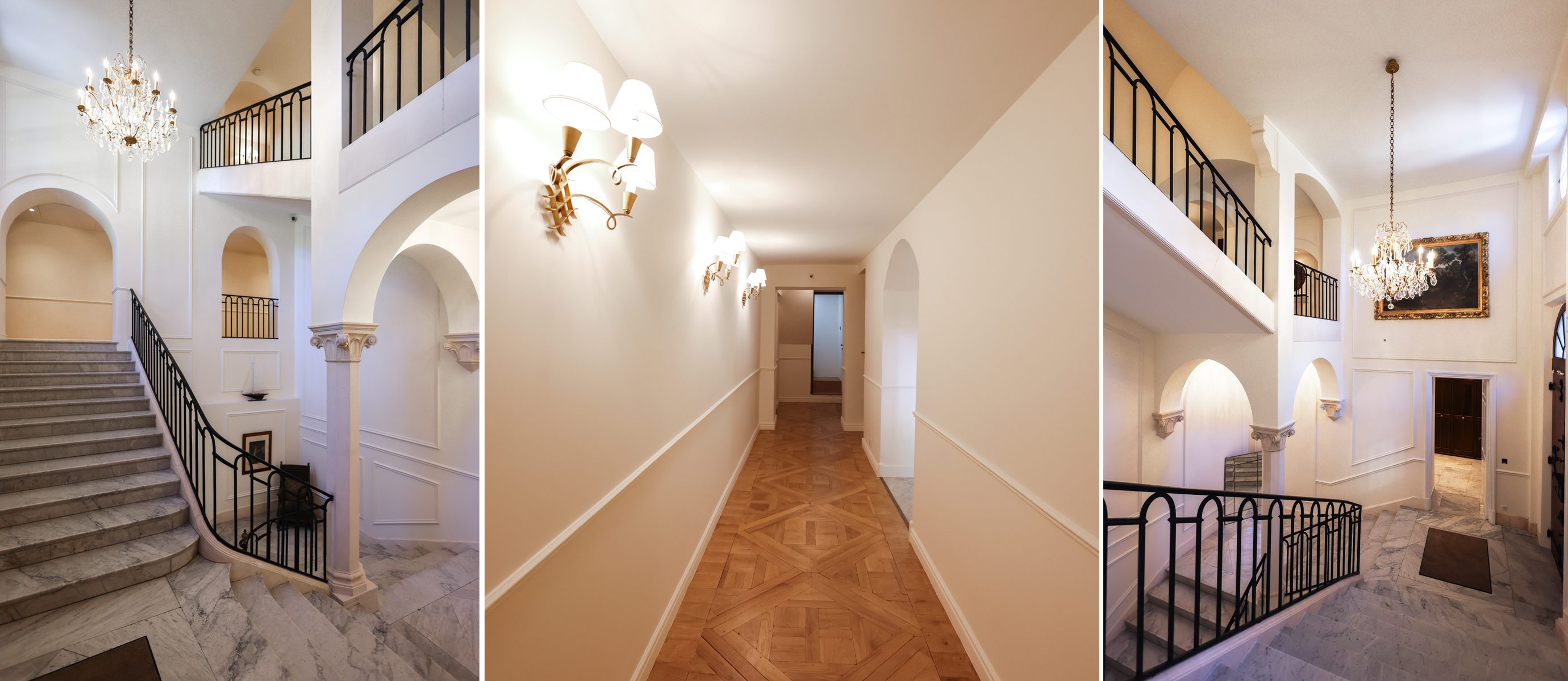 The 500m2 Ground Floor hosts the 80m2 « Grand Salon », 60m2 « smoking room & bar », 50m2 library, 50m2 dining room, and a culinary tract with a professional kitchen, pantry, wine tasting/storage, etc.