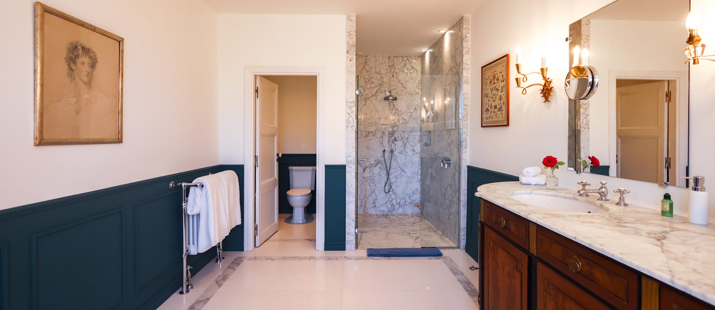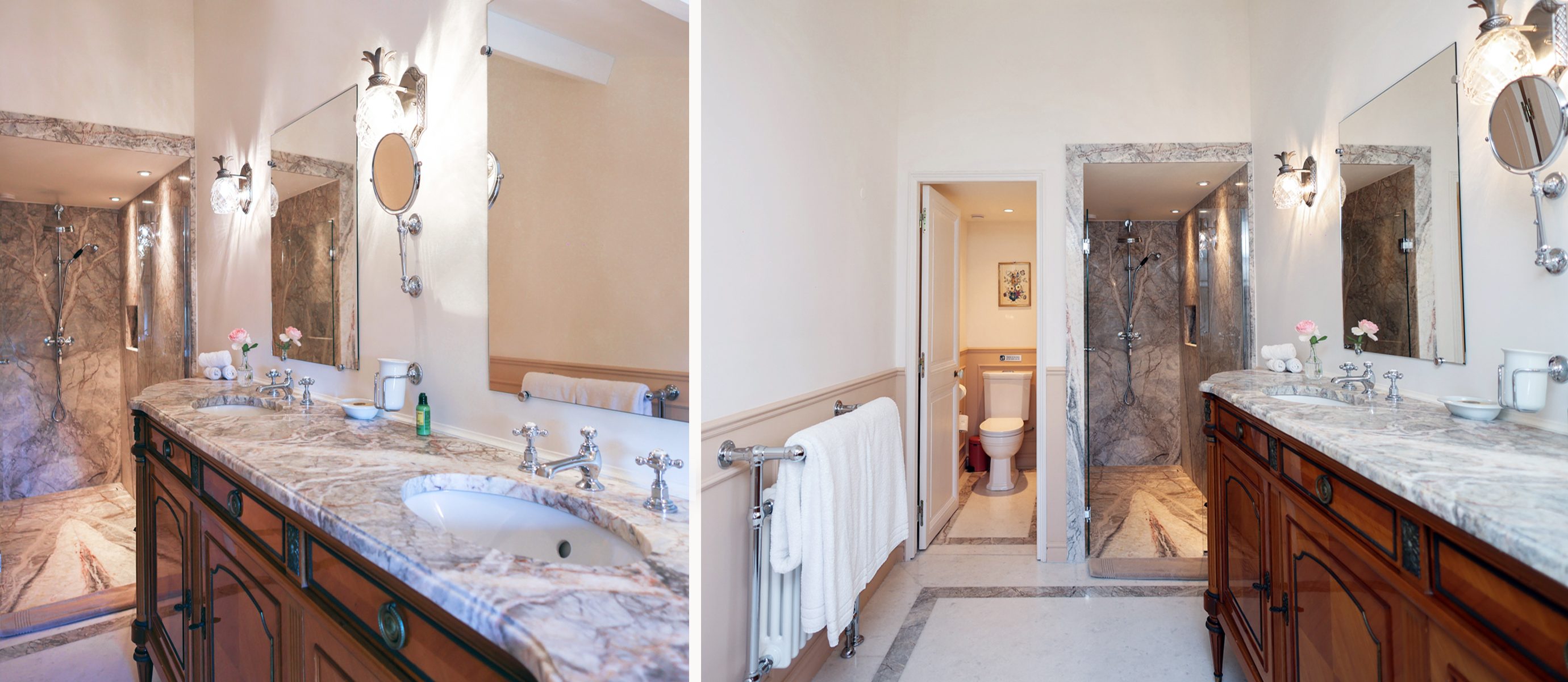 The North Wing offers another 4 luxury Garden View guest rooms with en-suite marble bathrooms, a wellness area with fitness, a hammam, a bathroom, a barber shop, and a living space for the live-in chef and housekeepers (4 bedrooms, 2 living rooms, 4 bathrooms).