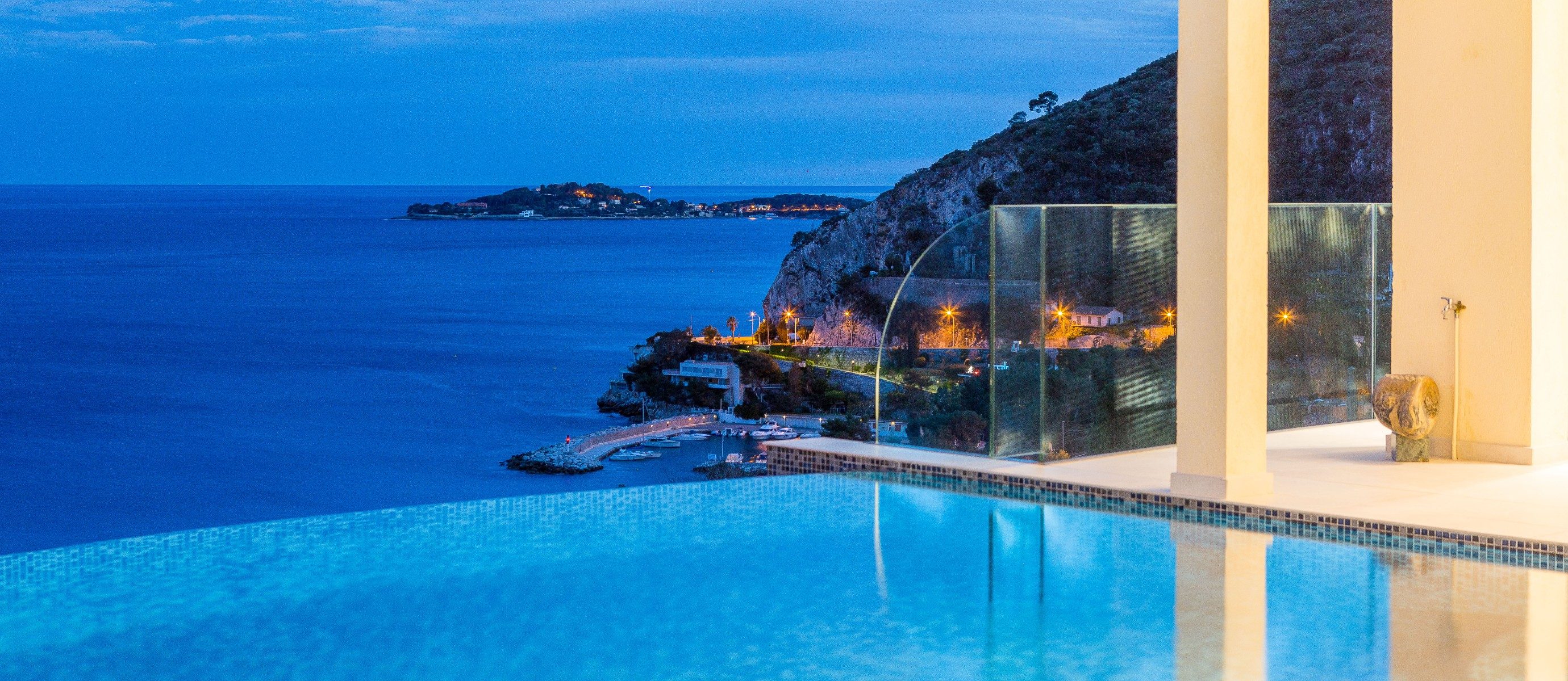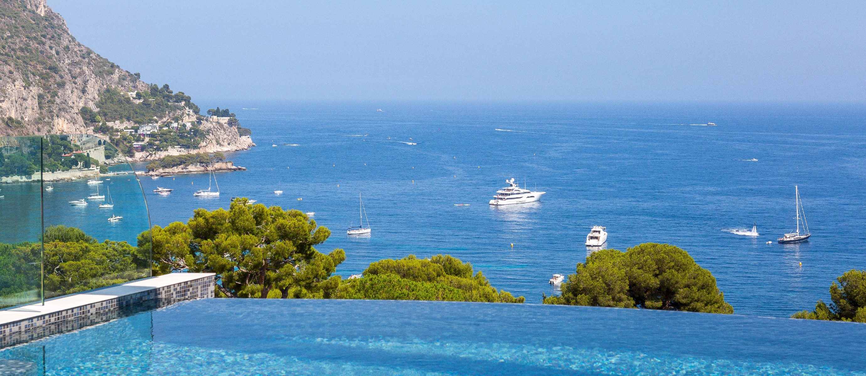 The property is nestled in a beautiful quiet residential area below Eze village, overlooking the middle of the bay of Eze. This part of the French Riviera is one of the most scenic stretches of coast between Nice and Monte Carlo. The villa is situated with 180º views of the Mediterranean Sea and surrounding coastal cliffs. It features a dramatic infinity pool with unobstructed views, and is a short walk to the beach.