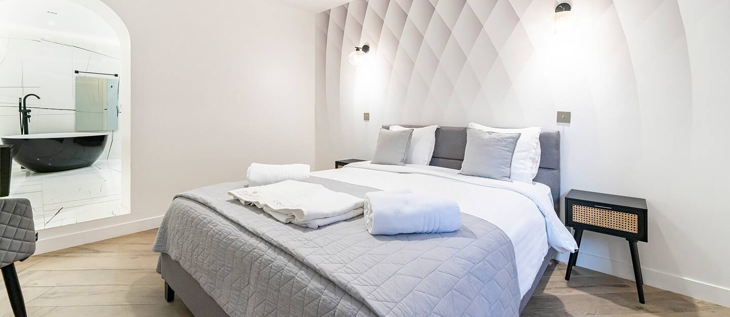 - King-size bed – A/C – Safe – En-suite bathroom with shower and bathtub.