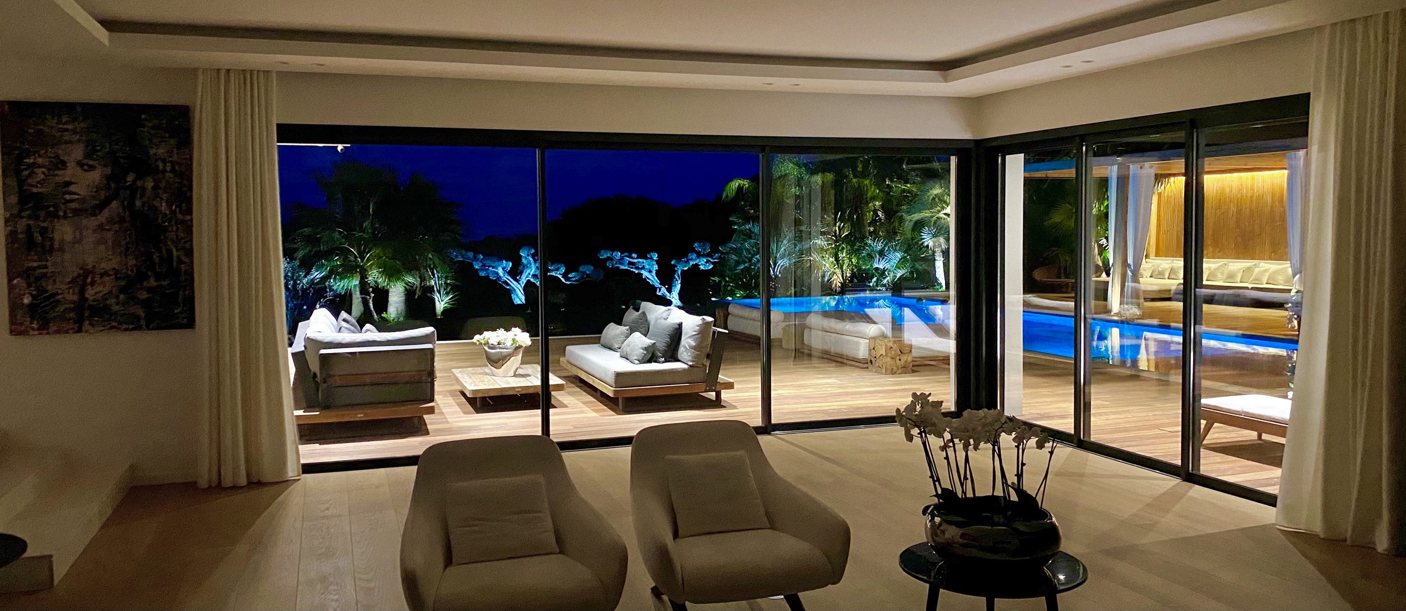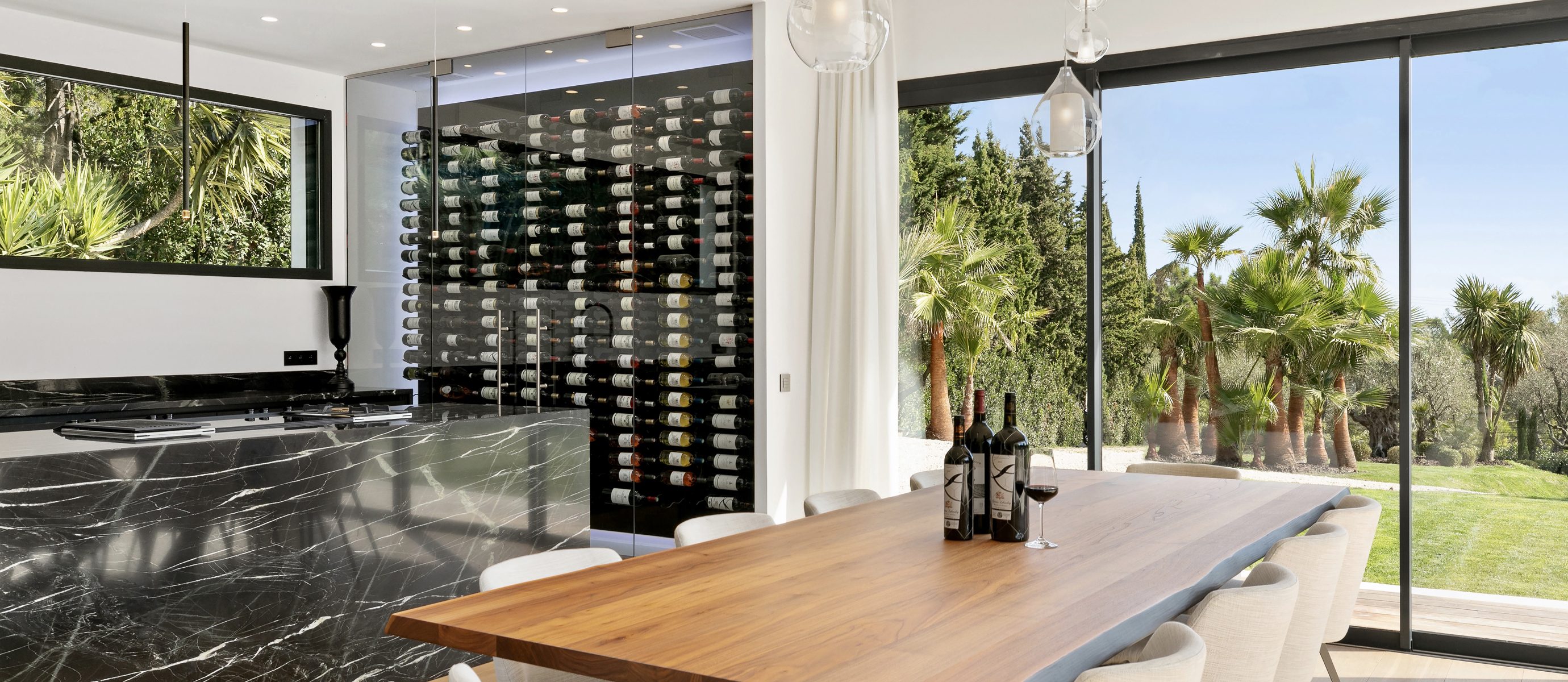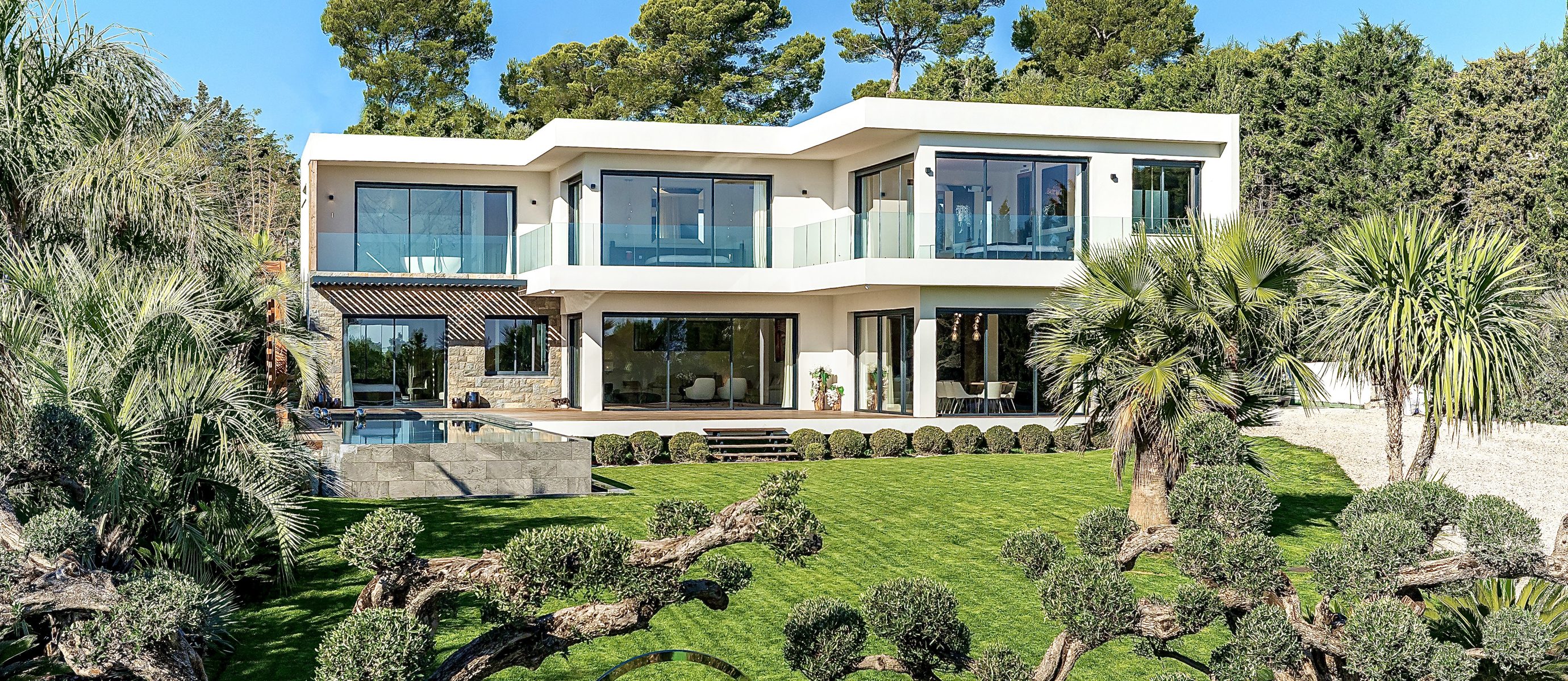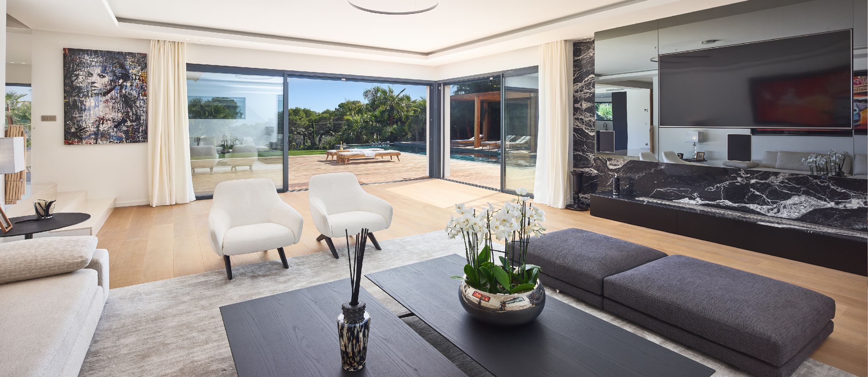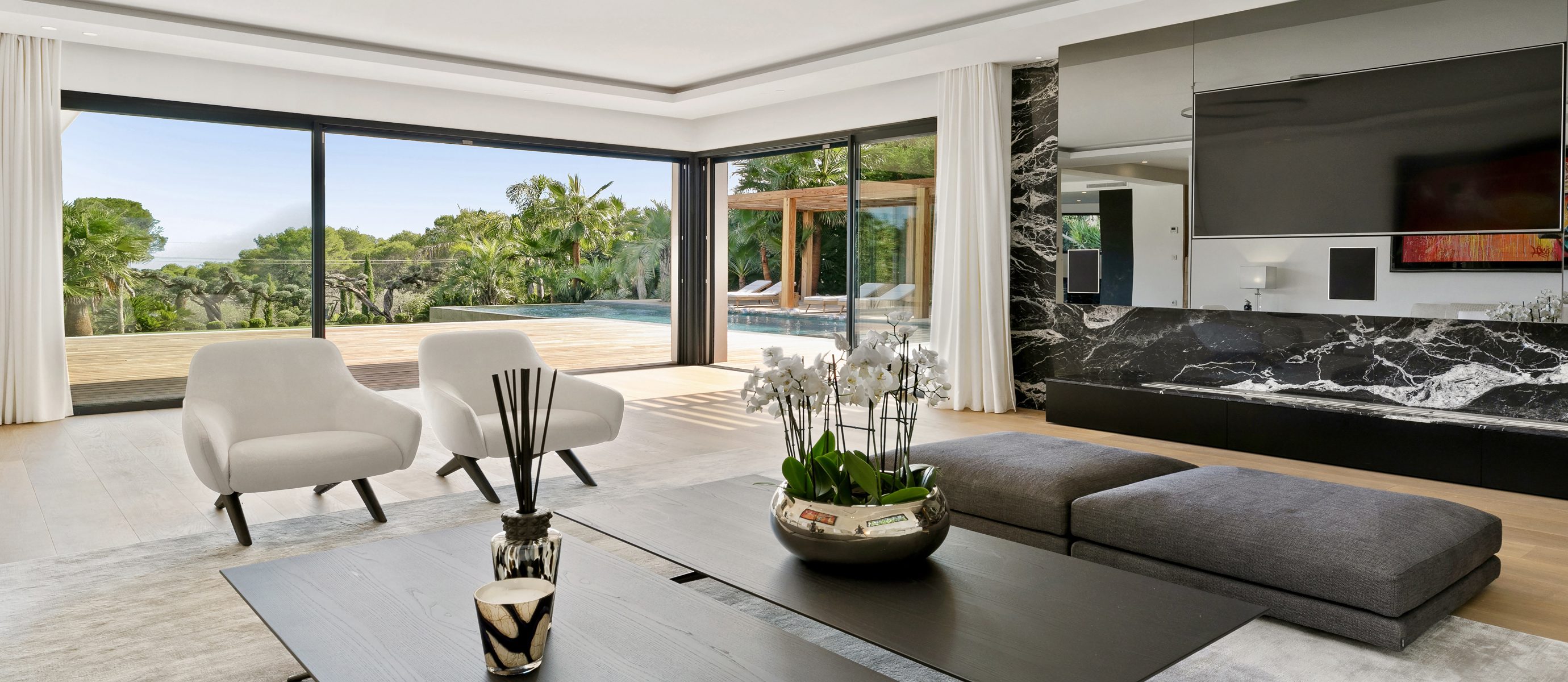 A modern sophisticated villa in one of the most sought-after areas of Mougins, with views to the sea. The floor-to-ceiling windows create a continuous indoor-outdoor flow for entertaining entertainmenting, lounges and a pool house with its heated infinity pool.