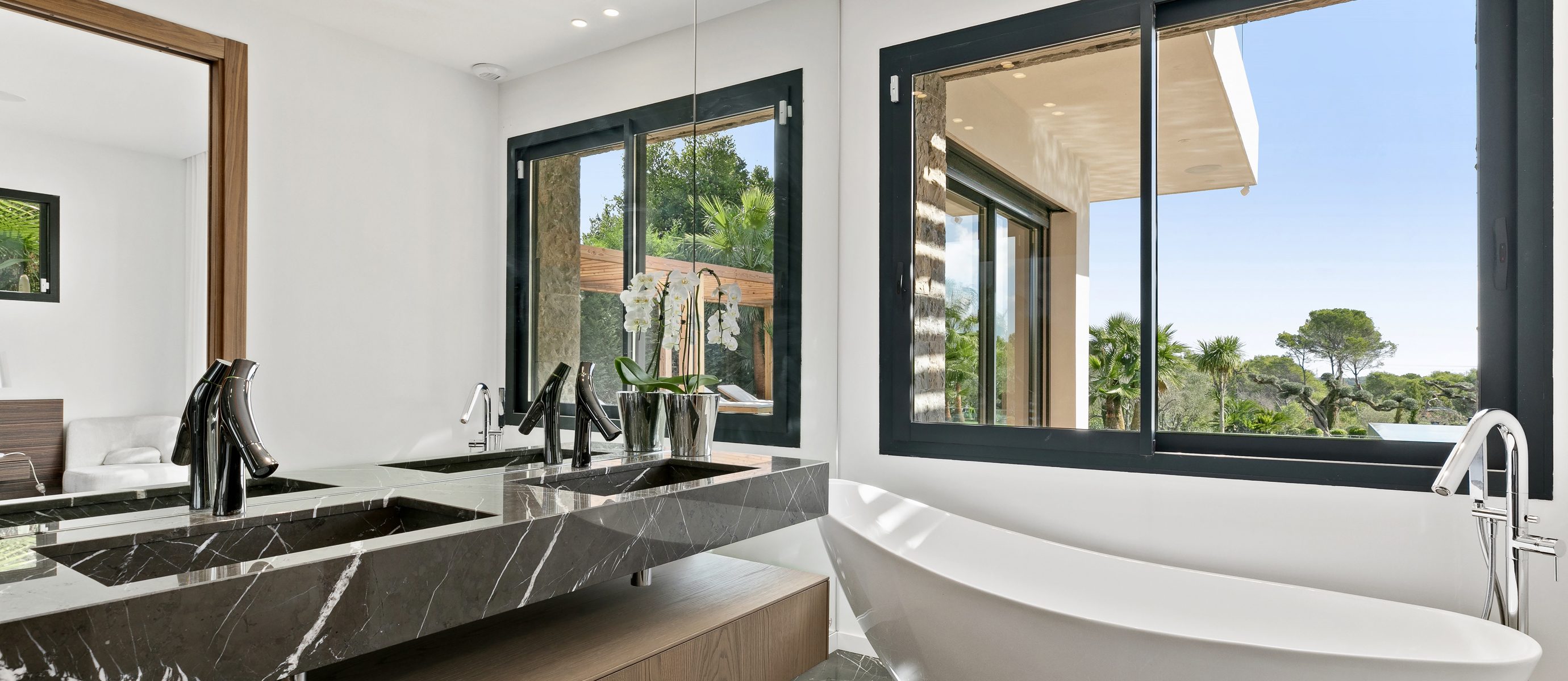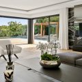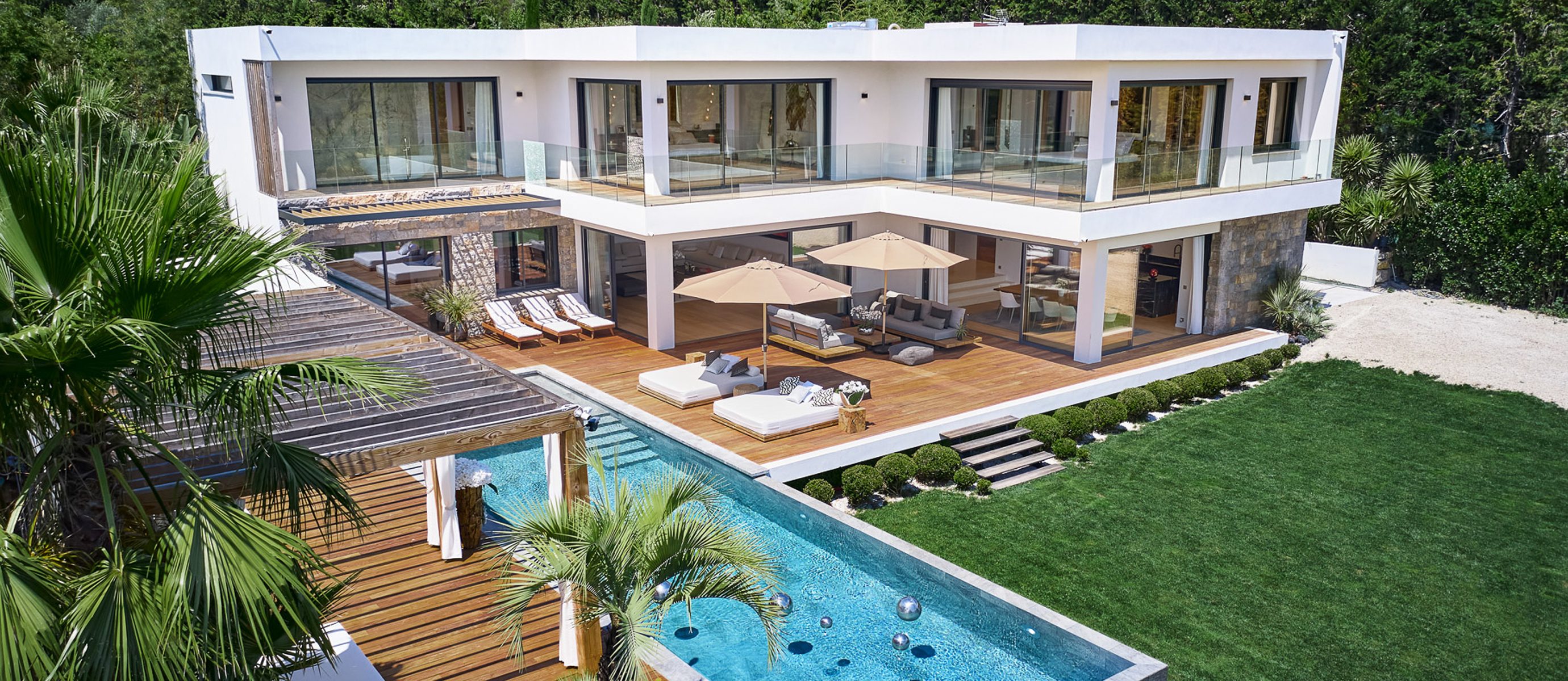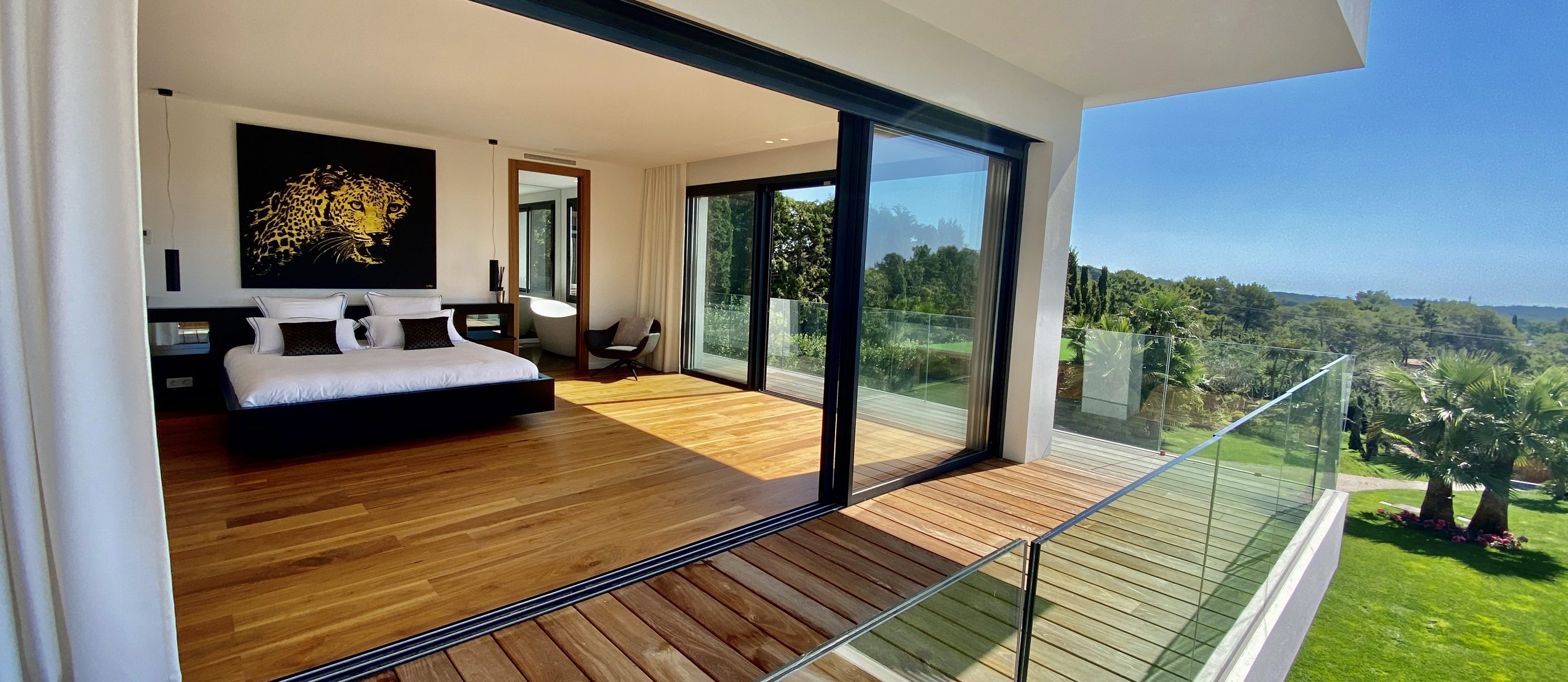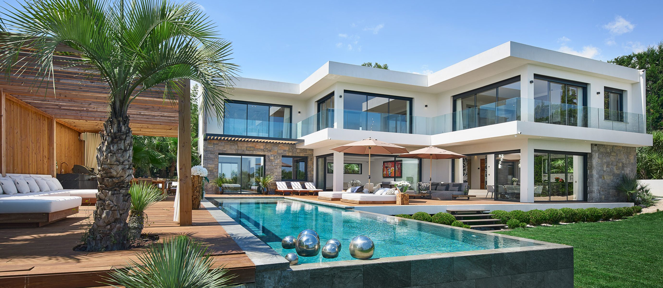 A modern sophisticated villa in one of the most sought-after areas of Mougins, with views to the sea. The floor-to-ceiling windows create a continuous indoor-outdoor flow for entertaining entertainmenting, lounges and a pool house with its heated infinity pool.