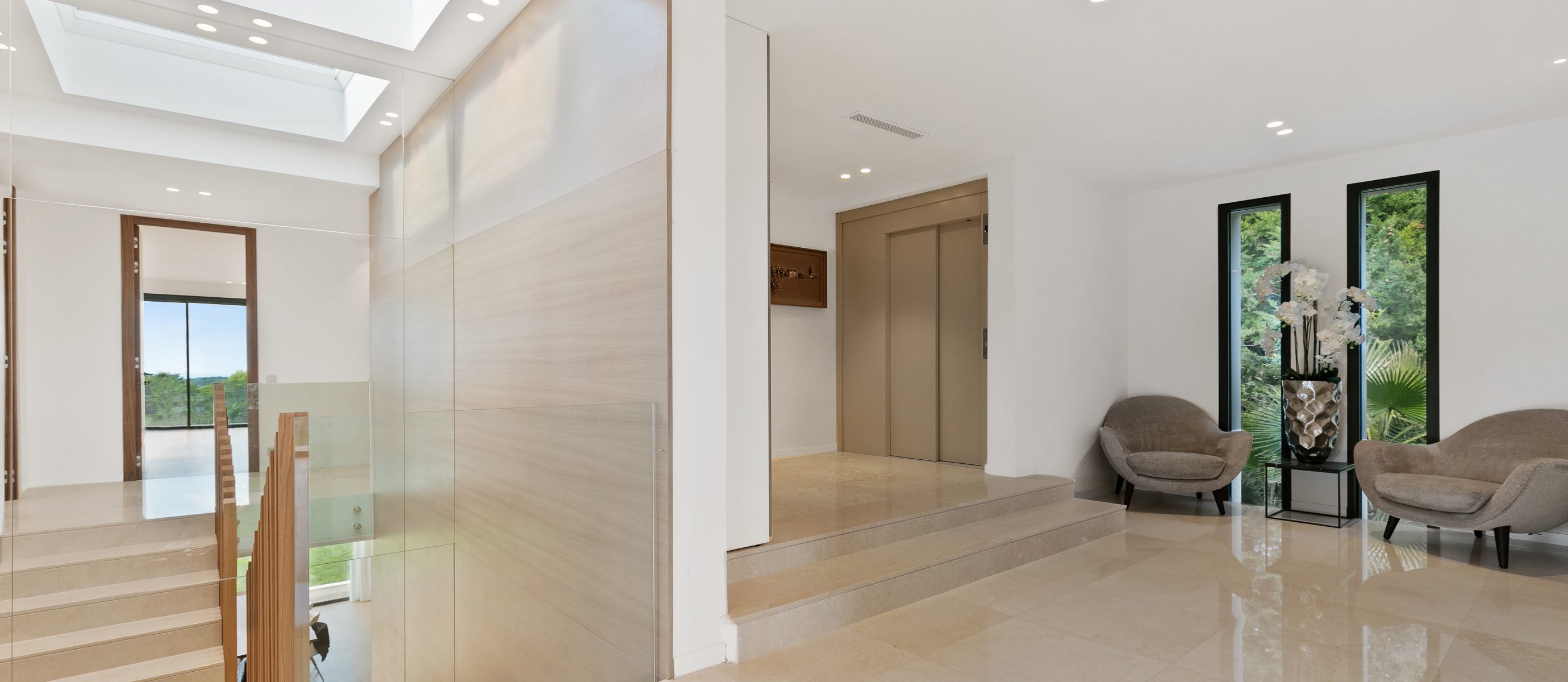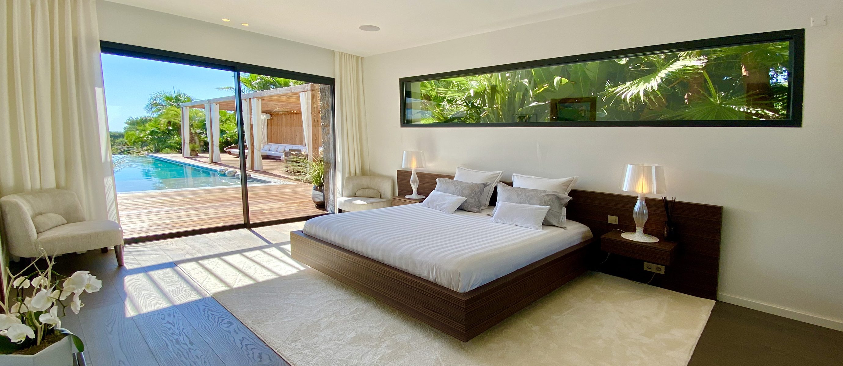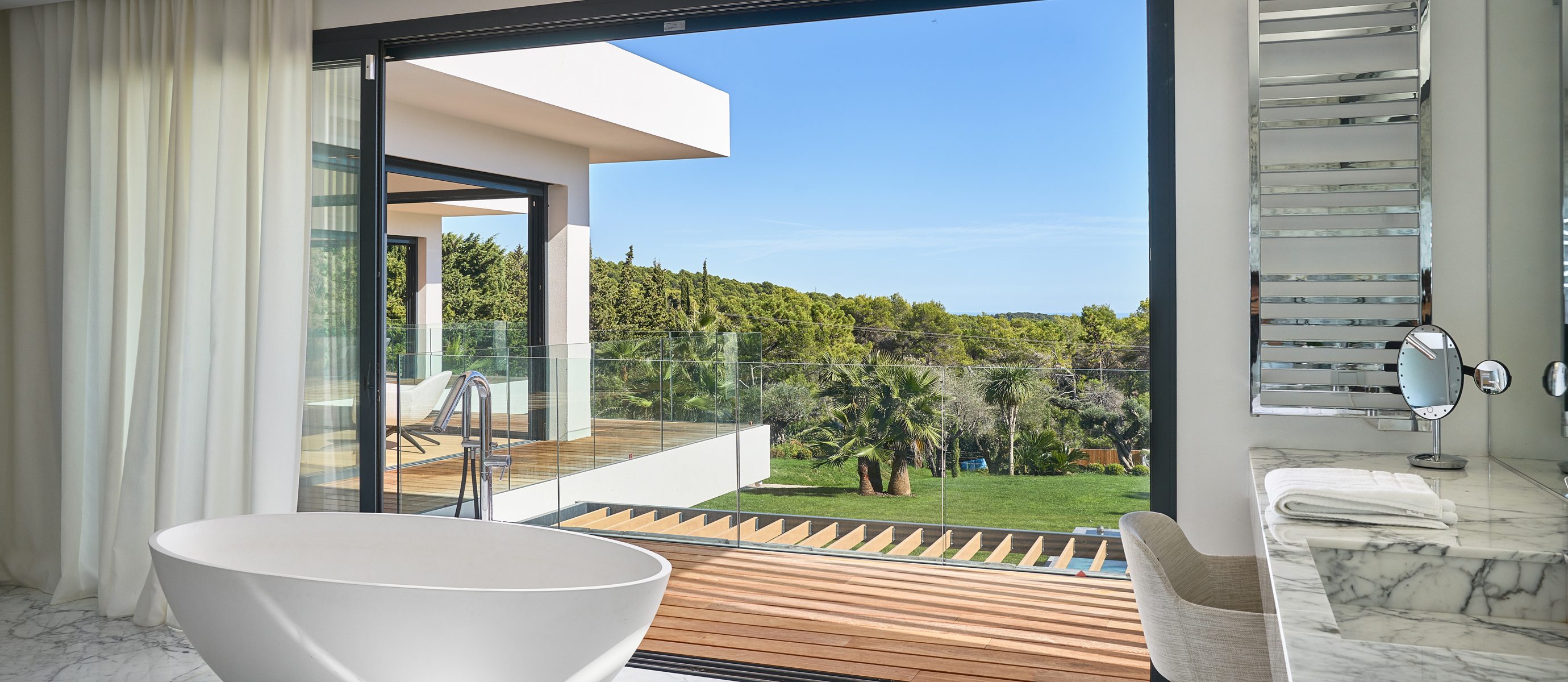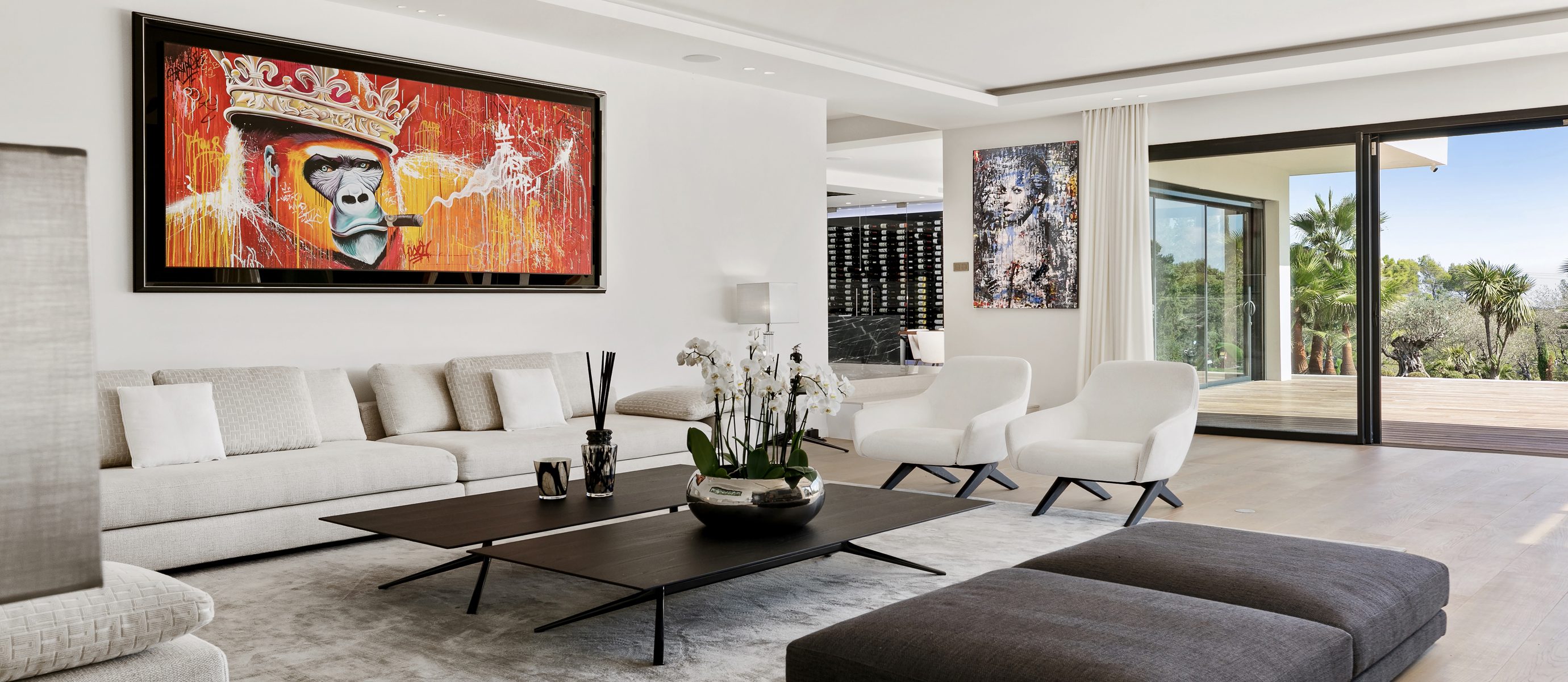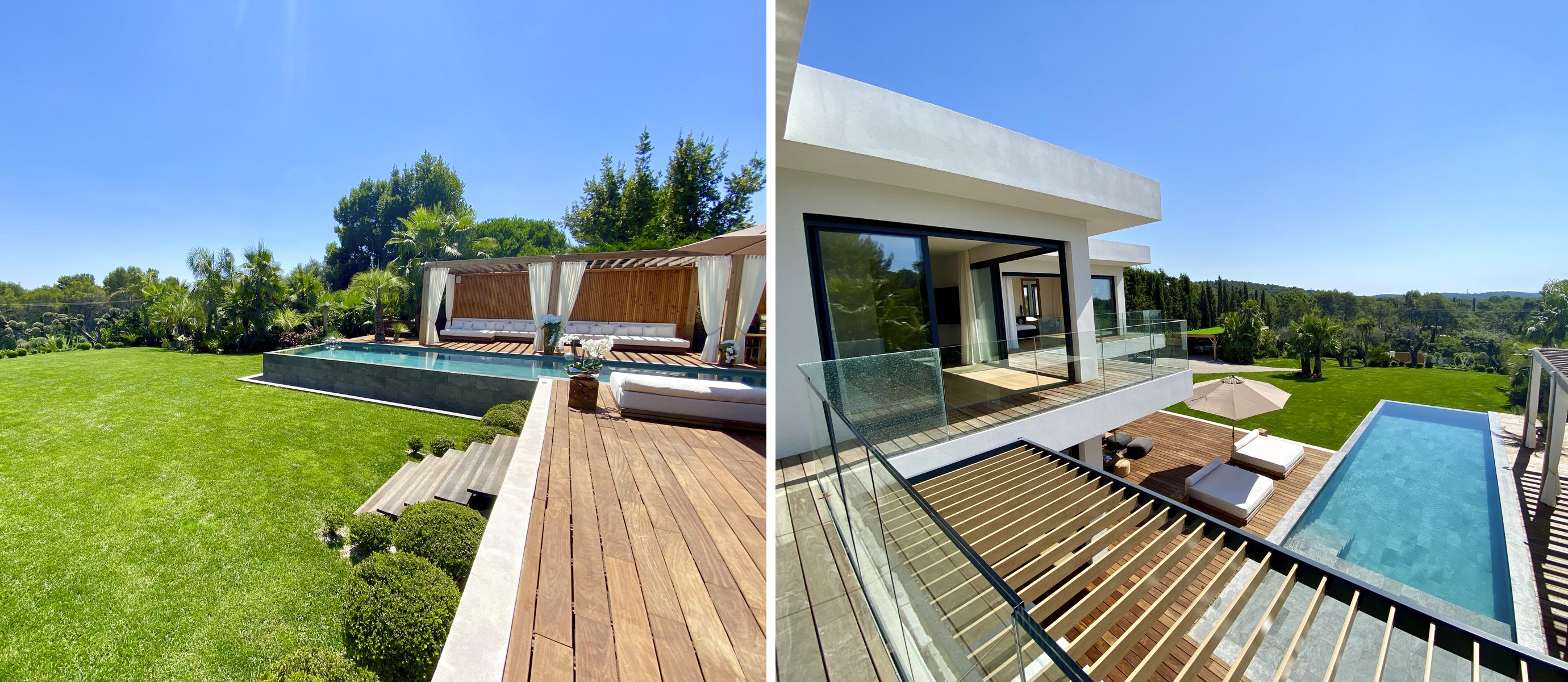 A modern sophisticated villa in one of the most sought-after areas of Mougins, with views to the sea. The floor-to-ceiling windows create a continuous indoor-outdoor flow for entertaining entertainmenting, lounges and a pool house with its heated infinity pool.