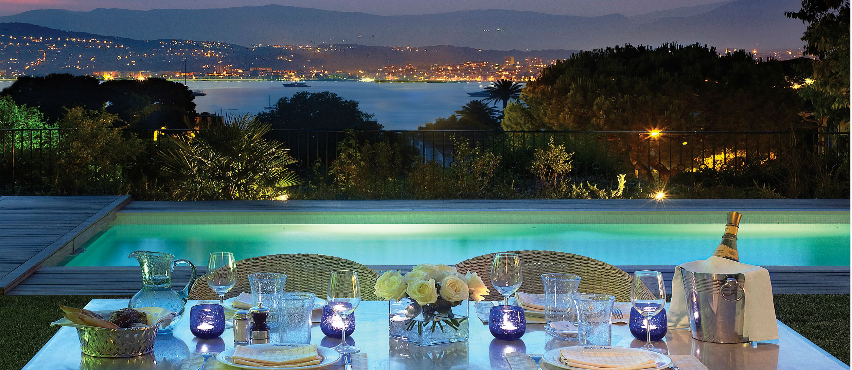 Overlooking the bay of Juan-les-Pins, the pool graces a beautiful landscape enlivened by the fragrance of citrus trees, whilst the spacious terrace on the upper floor presents stunning vistas of pristine gardens and the Mediterranean Sea.