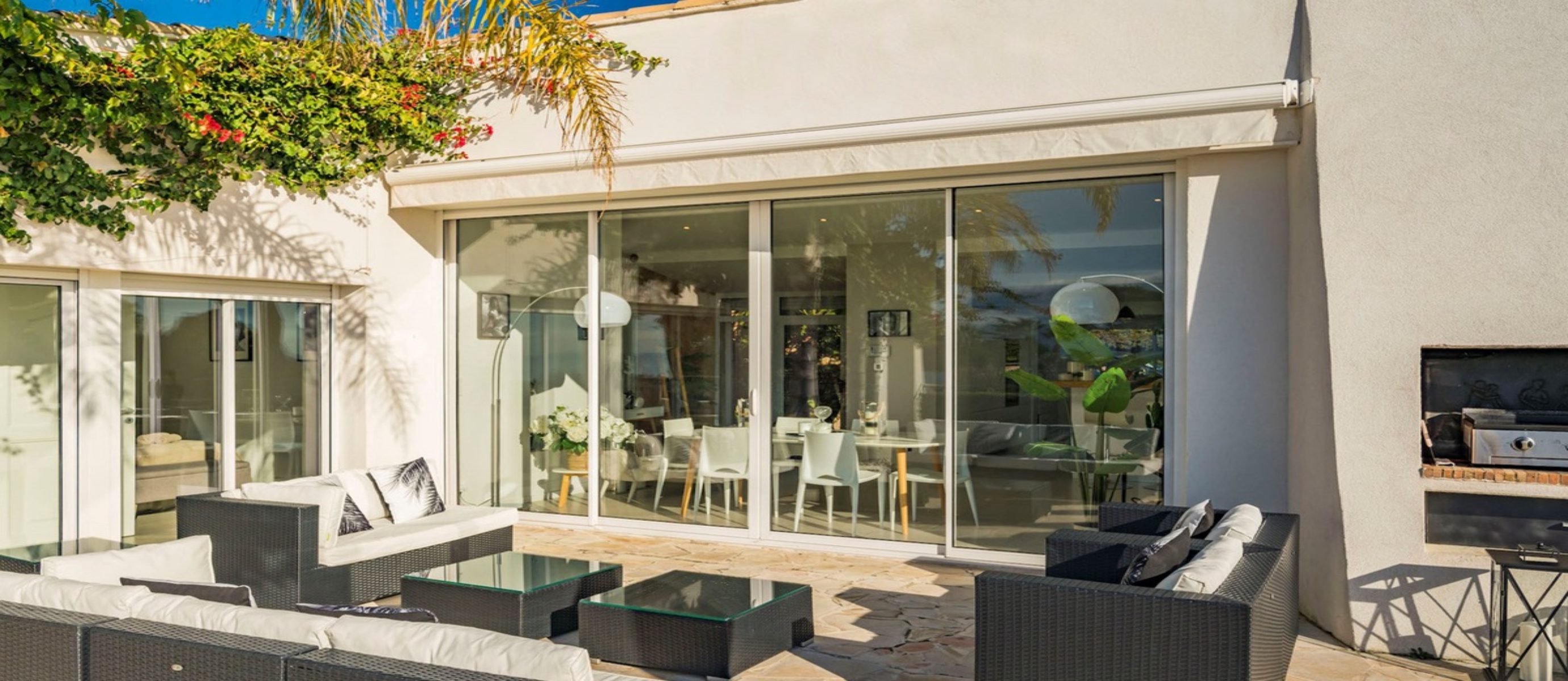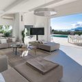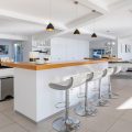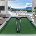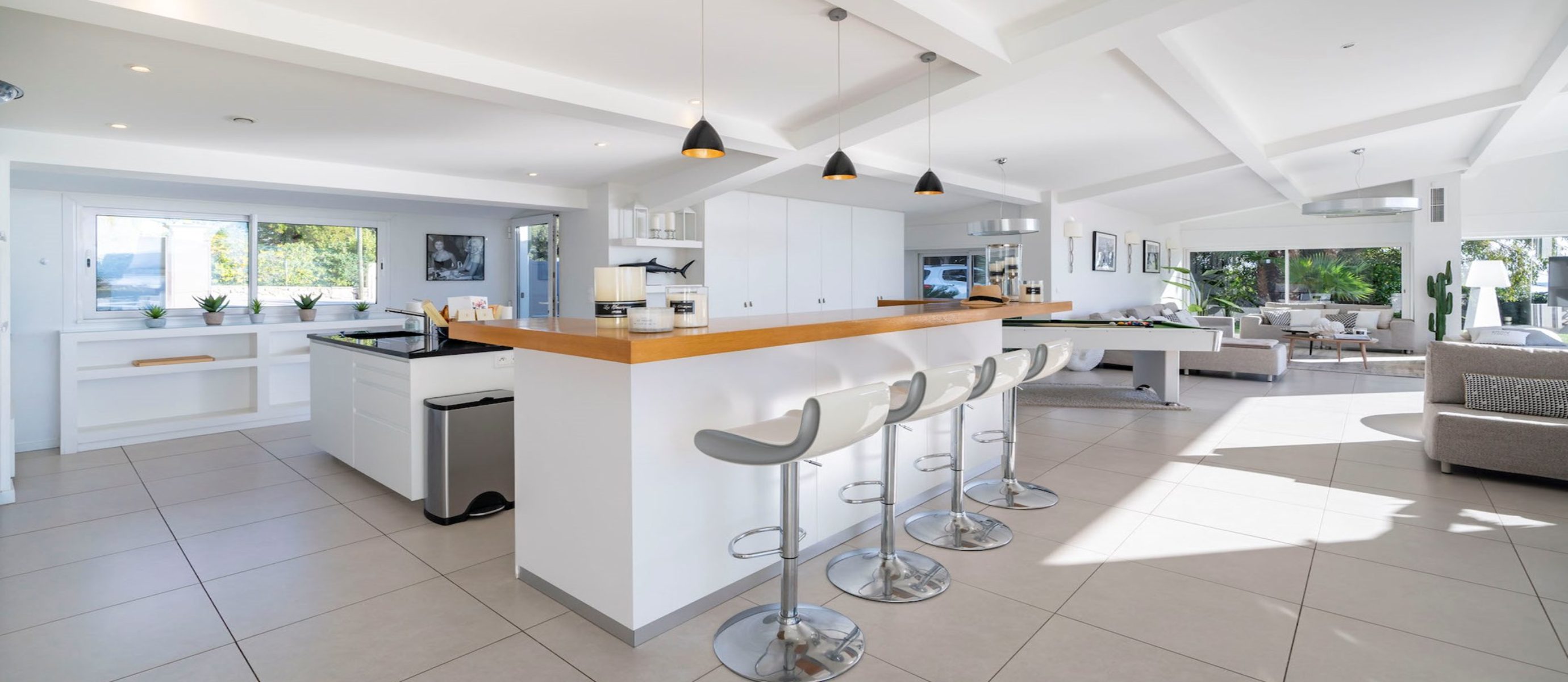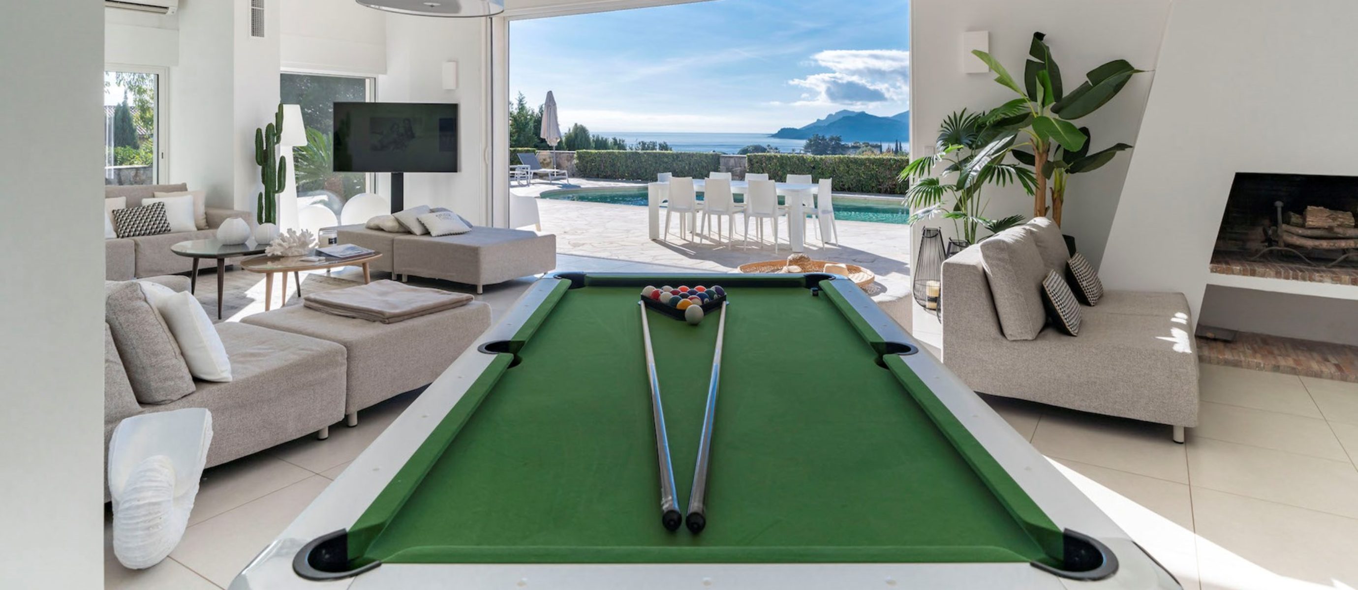 Entry level: Living room with pool table, open plan dining room with fireplace, all opening onto the terrace and swimming pool. Fully equipped kitchen open plan with breakfast bar and stools. Guest cloakroom and shower. Master bedroom (160 cms) with en-suite shower room, TV, and opening onto terrace and pool, with sea-views. Double bedroom (140 cms) with TV, en-suite bathroom and sea view. Twin bedroom with TV, en-suite bathroom.