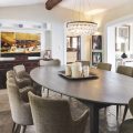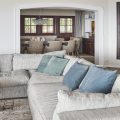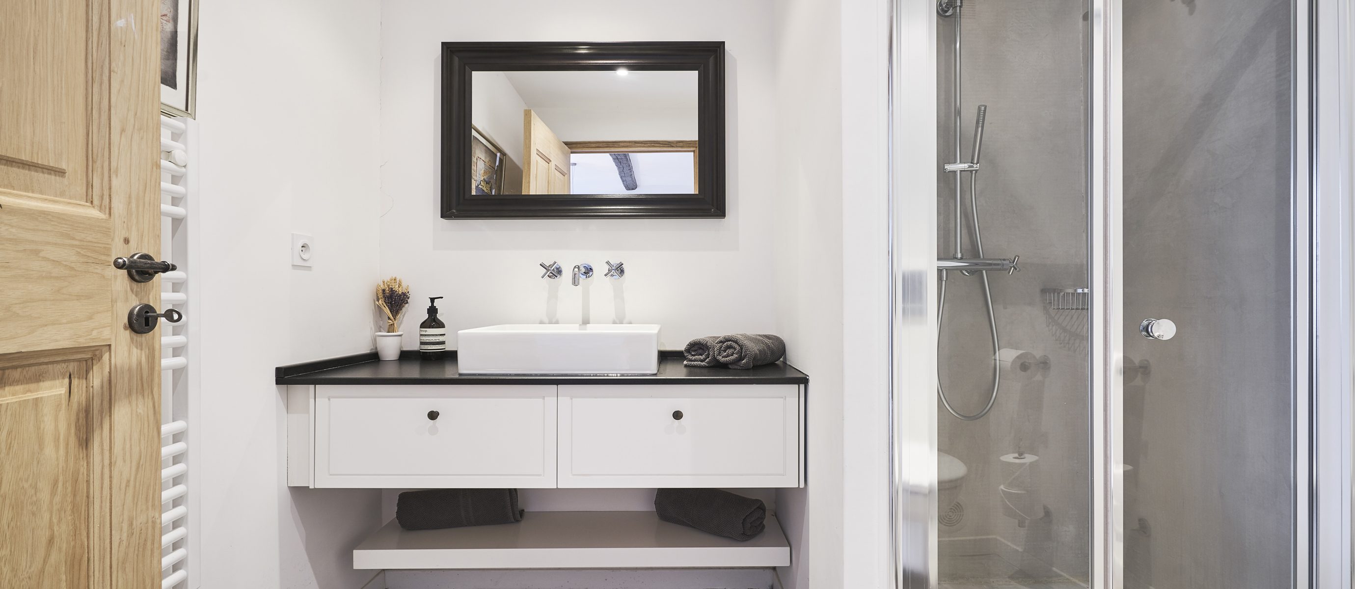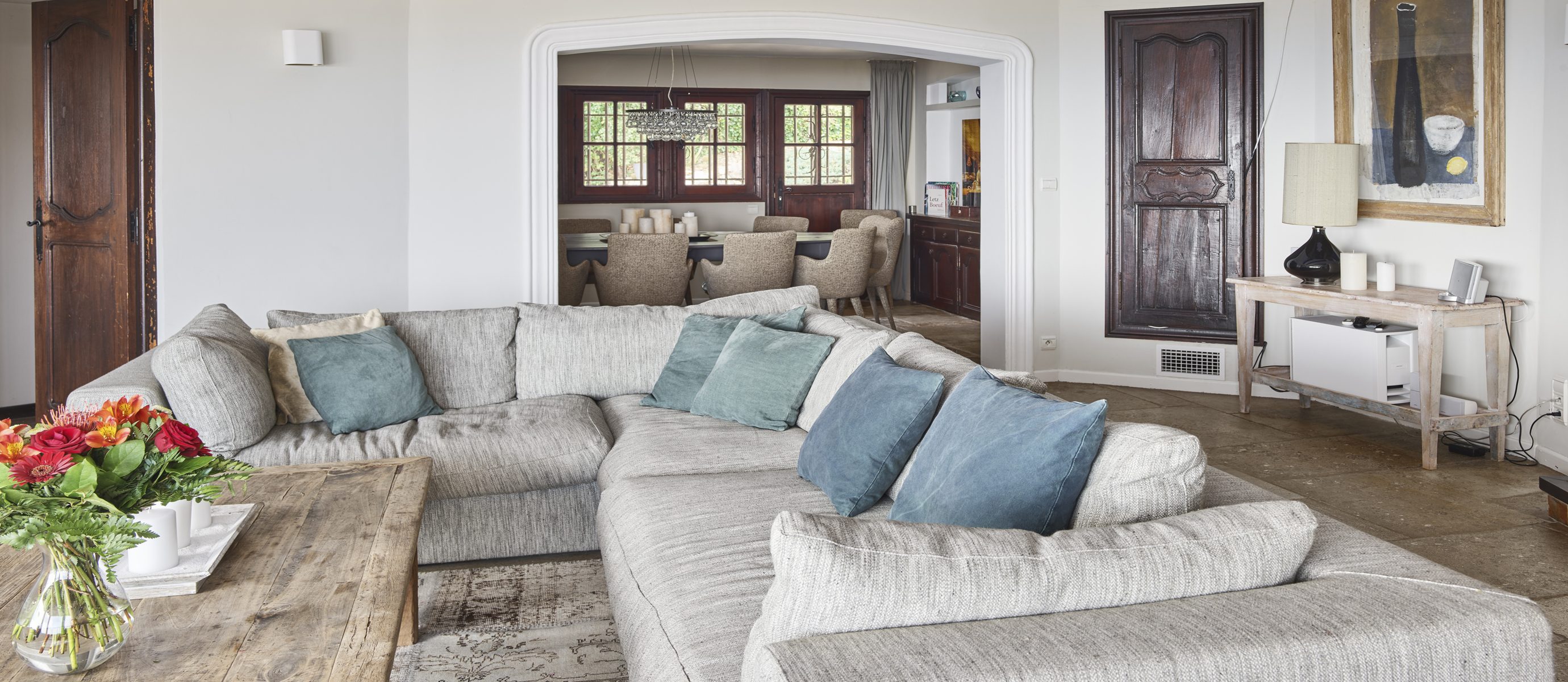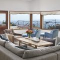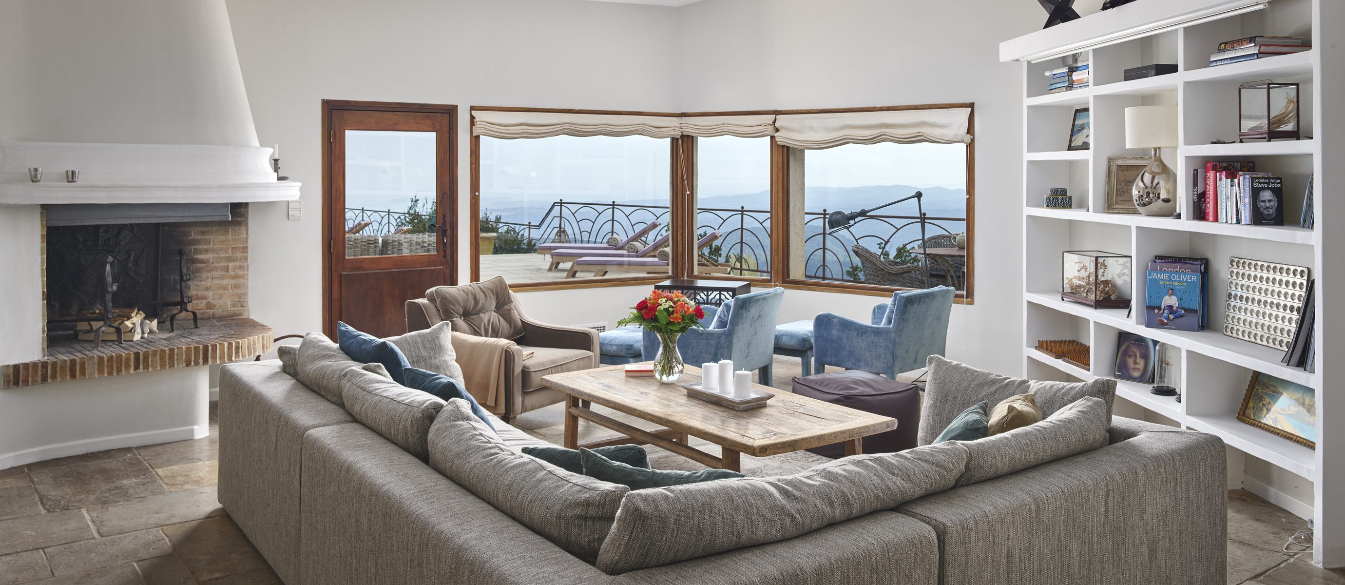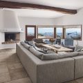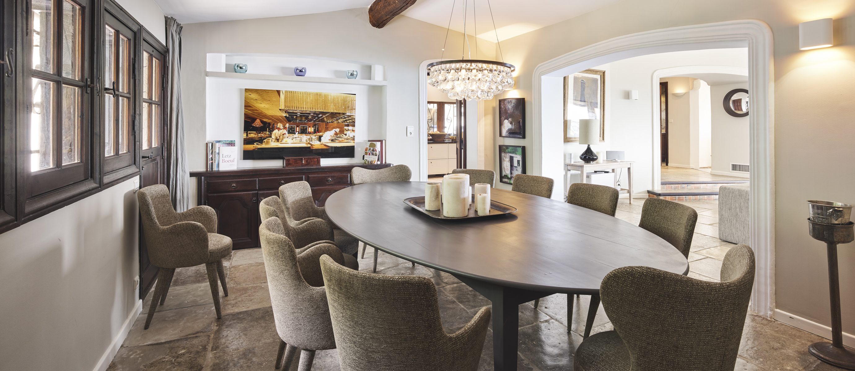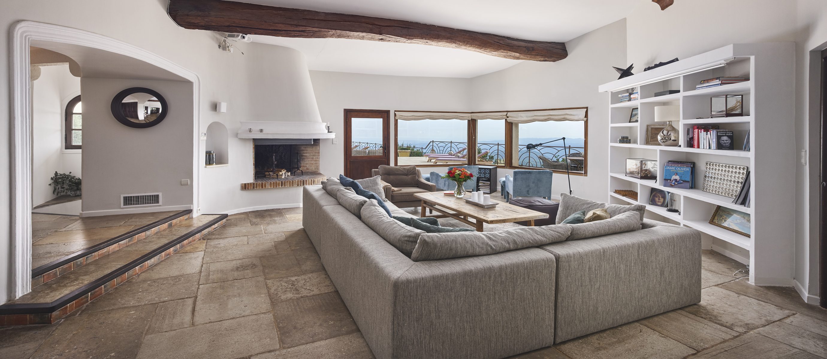In the living room there is a large sofa with space for the whole family, where you can either watch Apple TV on the large projector screen or enjoy the beautiful view of the Cote D’Azur next to the fireplace.