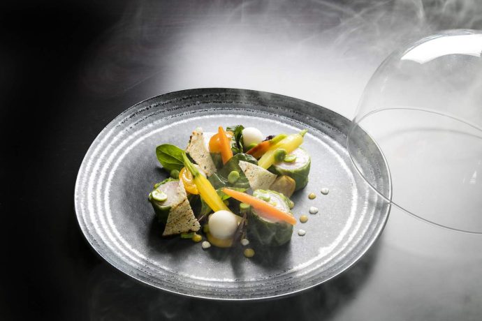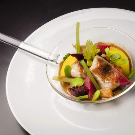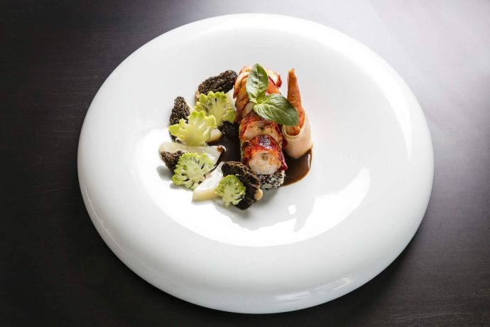 Patrick Raingeard offers a contemporary menu rich in seafood and local produce, such as Atlantic blue lobster, iced consommé and celery; or its capon in light emulsion of Anis, young leeks smoked and potatoes shot with “juice of parsley and clams”.