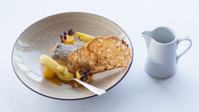 Thus, the back of lean, a fish with white flesh, is served with a citrus juice iodized with fennel and shellfish.