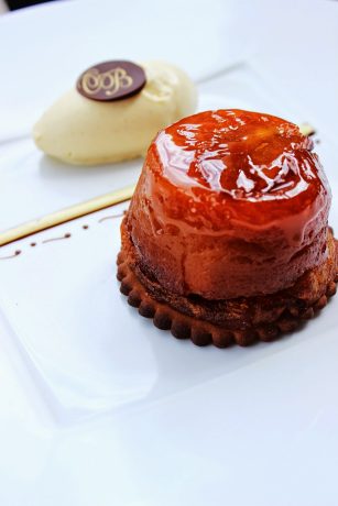 This farandole of gourmet dishes ends on a sweet note with the caramel crunchy caramel vanilla ice cream or guanaja chocolate heart liquid ice cream cherry.