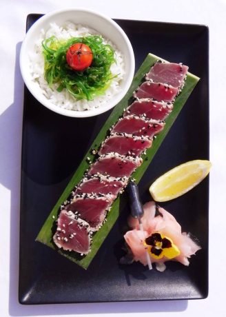 On the kitchen side, we appreciate the freshness of the products and the fish caught from the day cooked with precision and creativity: calamari with plancha with lemon thyme, basmati rice, virgin sauce; half-cooked tuna with white and green sesame, Basmati rice with wakame seaweed; sea bream (for one or two people); Beef filet à la plancha and its thyme juice, potatoes and vegetables from the market … T